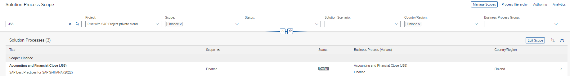 After you have prepared the scope, you can select solution processes that fit into that scope. All of the processes that belong to the best practice solution (like SAP Best Practices for SAP S/4HANA) are shown in the process list. For example, Accounting and Financial close (J58) could be selected as Best Practice processes in the Finance scope.